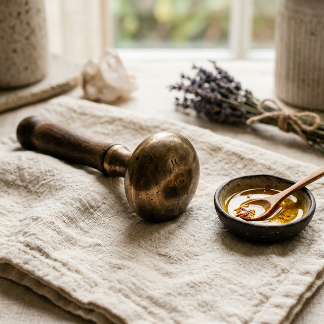 Detoxifying facial massage using the traditional bronze 'Kansa' wand.
