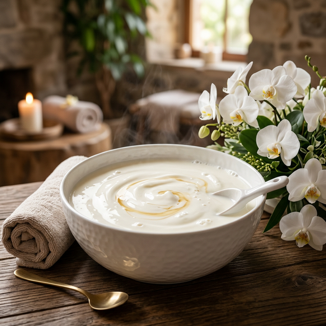 Nourishing body wrap using pure cream and essential extracts for glowing skin.