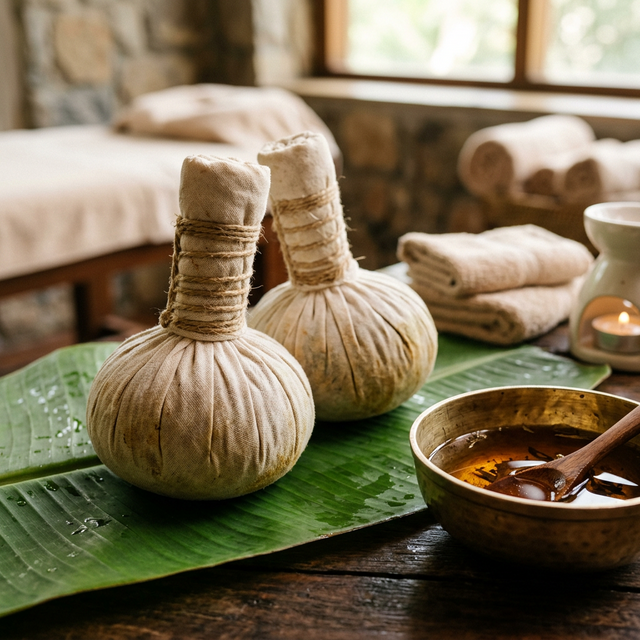 Ancient Ayurvedic treatment using herbal compresses to relieve stiffness.
